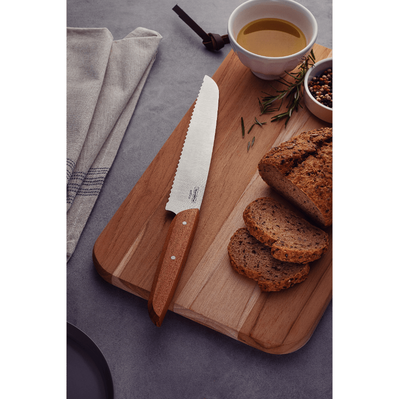 Your breakfast looks even better with that delicious bread, doesn't it?! And to prepare it in the best way, use the Tramontina Verttice Bread Knife with stainless steel blade and 8-inch natural wood handle. Perfect for slicing different types of bread without kneading them, it is produced with a stainless steel blade and a natural wooden handle with stainless steel rivets that provides a rustic look to the piece and greater durability. The perfect knife to help you start the day in the best way!